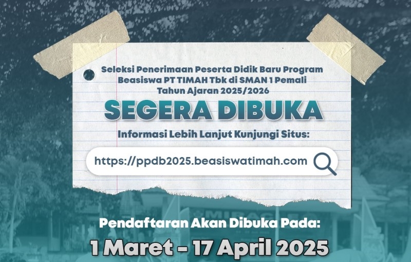 Pendaftaran Program Kelas Beasiswa PT Timah Tbk Pada SMAN 1 Pemali Tahun Ajaran 2025/2026 akan dimulai pada 1 Maret-17 April 2025. Pendaftaran dapat dilakukan melalui laman https://ppdb2025.beasiswatimah.com