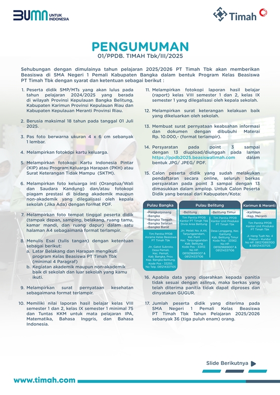 KILASBABEL.COM – PT Timah kembali membuka pendaftaran program Kelas Beasiswa PT Timah pada SMAN 1 Pemali Tahun Ajaran 2025/2026.