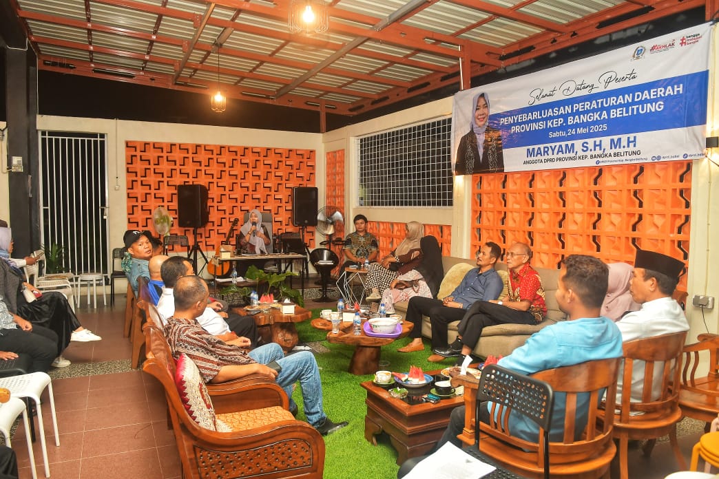 KILASBABEL.COM – Anggota DPRD Provinsi Kepulauan Bangka Belitung (Babel), Maryam, melaksanakan kegiatan sosialisasi penyebarluasan Peraturan Daerah (Perda) Nomor 4 Tahun 2019 tentang Ketenagakerjaan. Kegiatan ini digelar di Tepian Café, Kecamatan Pangkalan Baru, Bangka Tengah, Sabtu (24/5/2025), dan dihadiri oleh sejumlah tokoh masyarakat, perwakilan dinas, serta serikat pekerja.