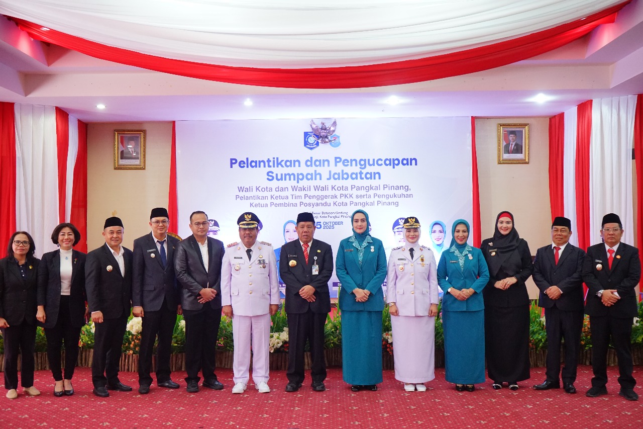KILASBABEL.COM – Prof Saparudin dan Dessy Ayutrisna, Rabu (15/10/2025), resmi menjabat Wali Kota dan Wakil Wali Kota Pangkalpinang, usai menjalani prosesi pengucapan sumpah jabatan dan pelantikan, yang dipimpin Gubernur Bangka Belitung (Babel), Hidayat Arsani, di Balai Besar Betason, Gedung Tudung Saji Kantor Wali Kota Pangkalpinang.
