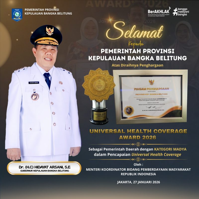 Dengan raihan UHC Award 2026 Kategori Madya, Pemerintah Provinsi Kepulauan Bangka Belitung menegaskan komitmennya di bawah kepemimpinan Gubernur Hidayat Arsani untuk terus menghadirkan pelayanan kesehatan yang inklusif, berkelanjutan, dan berpihak kepada rakyat. (*)