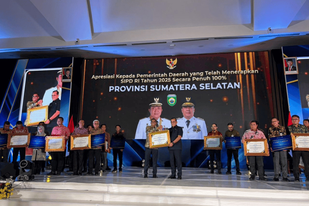 Pemberian apresiasi Bank Sumsel Babel kepada pemerintah daerah di Provinsi Sumsel dan Babel yang telah menerapkan SIPD RI tahun 2025 secara penuh, dalam acara yang digelar di Hotel Aryaduta Palembang, Kamis (29/1/2026). (IST)