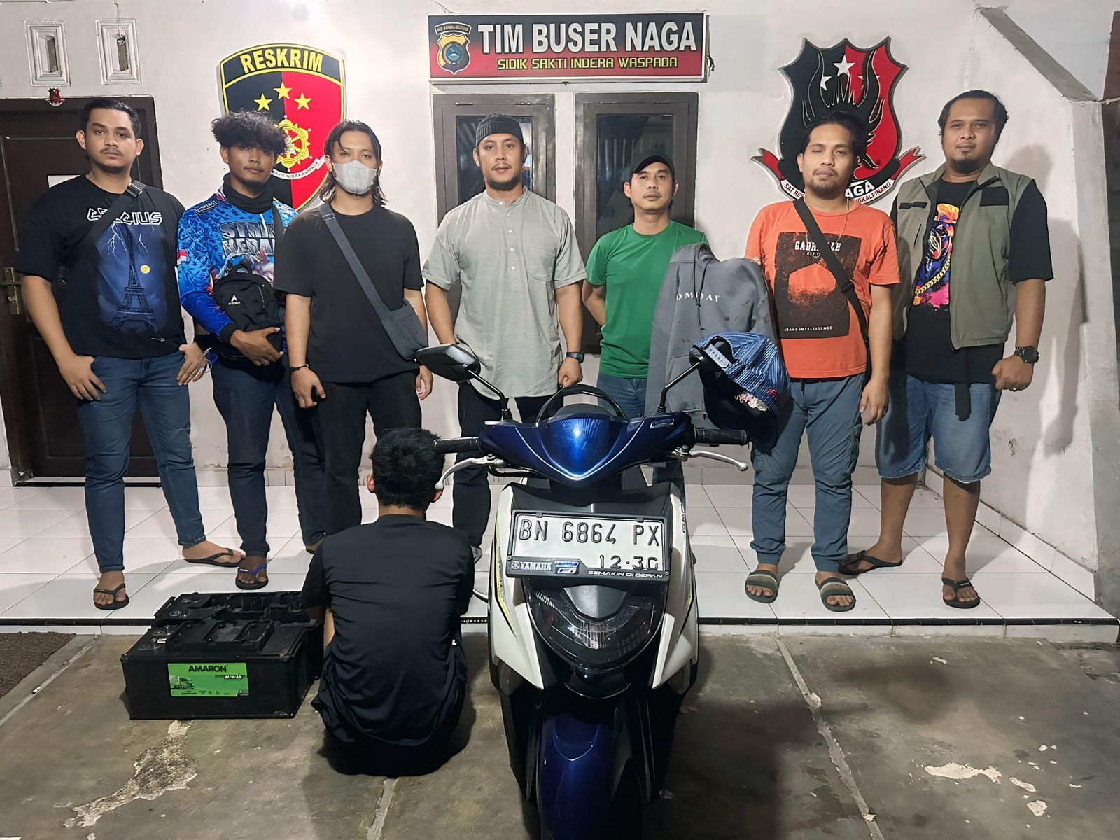 Barang bukti yang berhasil diamankan antara lain satu unit motor Yamaha Gear putih, dua buah aki AMARON, dan satu helai hoodie abu-abu bertuliskan “SOMEDAY”.